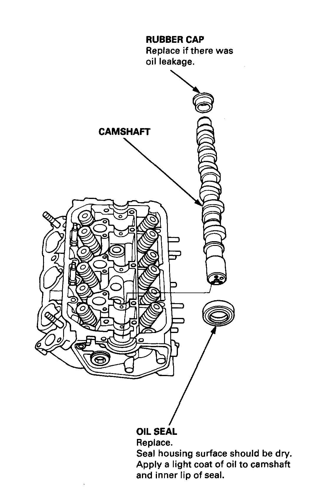 1. Install the camshaft and rubber cap, then install the camshaft seal with the open side (spring) facing in.