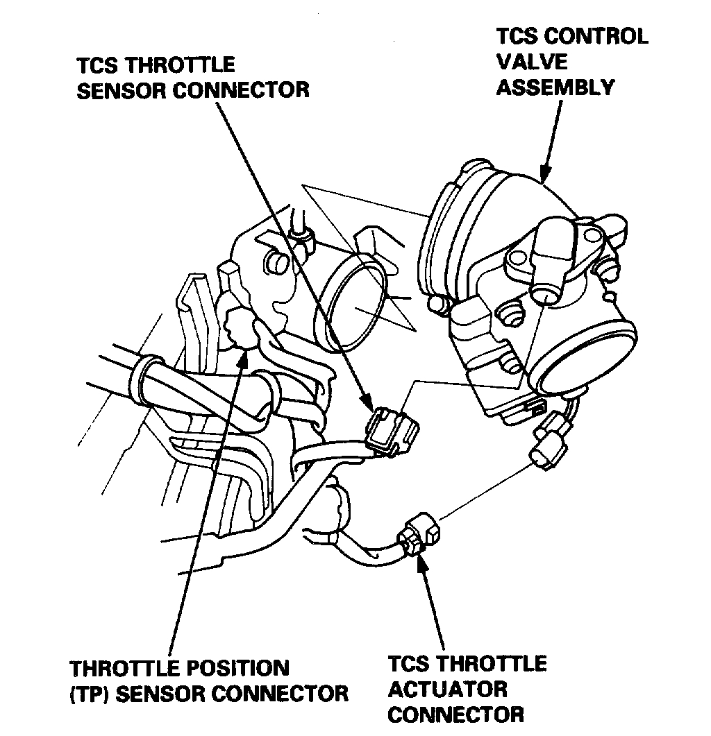 7. Disconnect the TCS throttle sensor connector, the TCS throttle actuator connector, and the throttle position (TP) sensor connector, then remove the TCS control valve assembly.