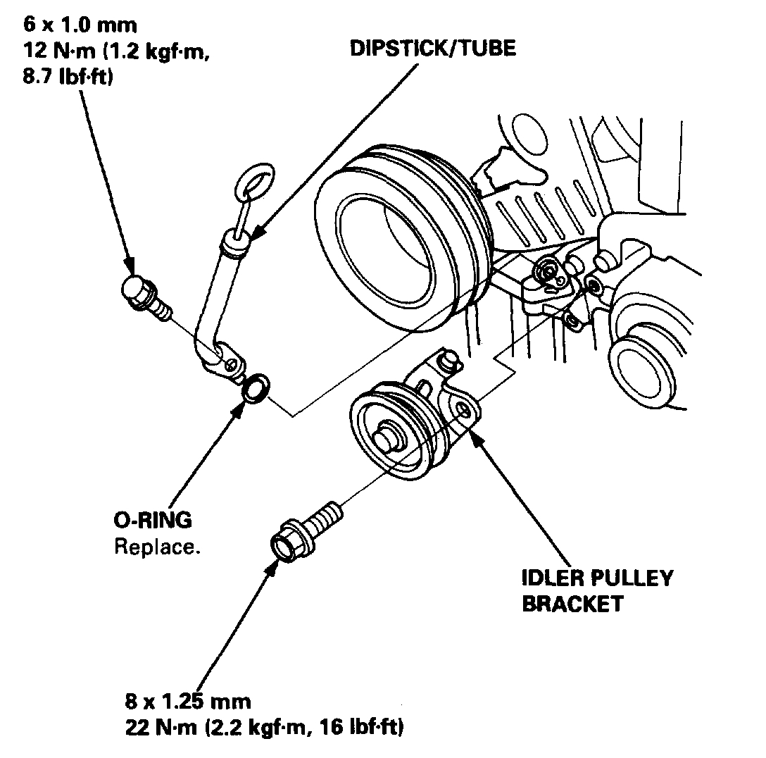 11. Remove the idler pulley bracket, dipstick and tube.