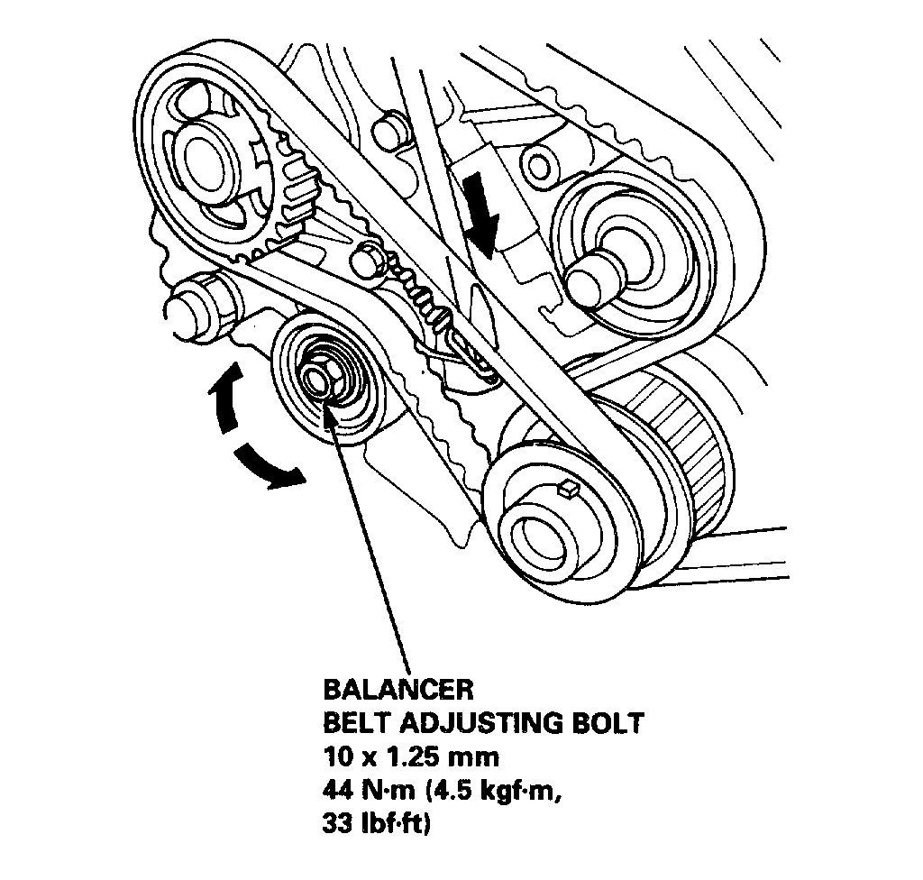 6. Loosen and retighten the timing belt adjusting bolt to tension the timing belt.