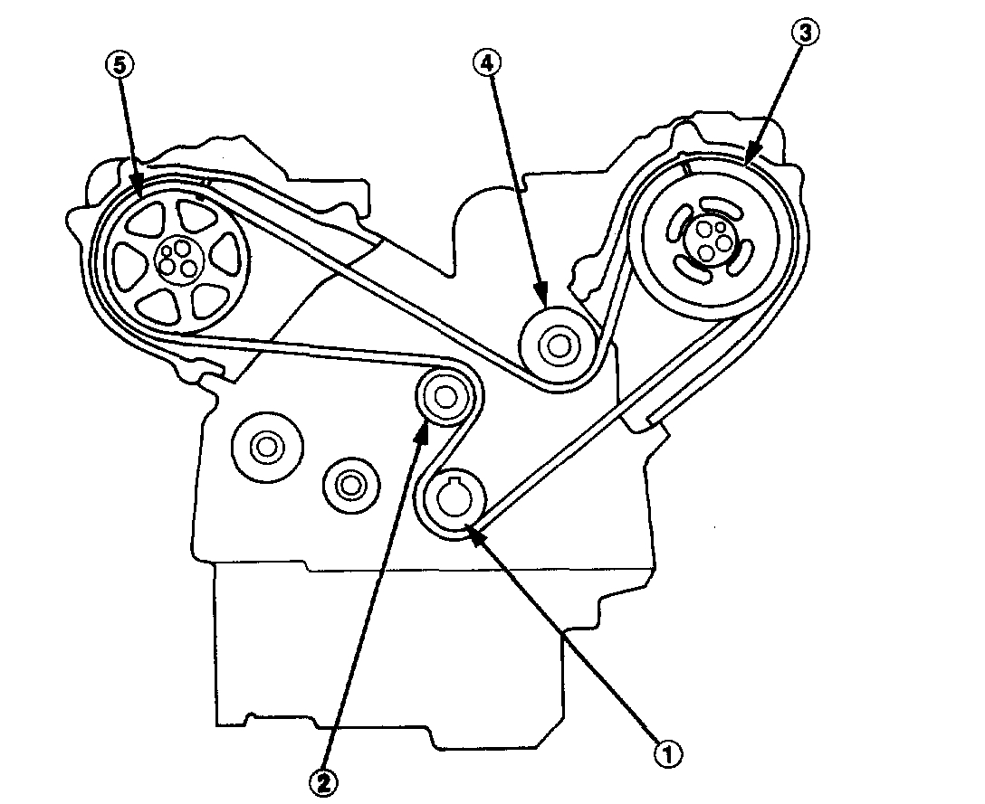 (1)Timing belt drive pulley (crankshaft) -> (2) Adjusting pulley -> (3) Left camshaft pulley -> (4) Water pump pulley -> (5) Right camshaft pulley.