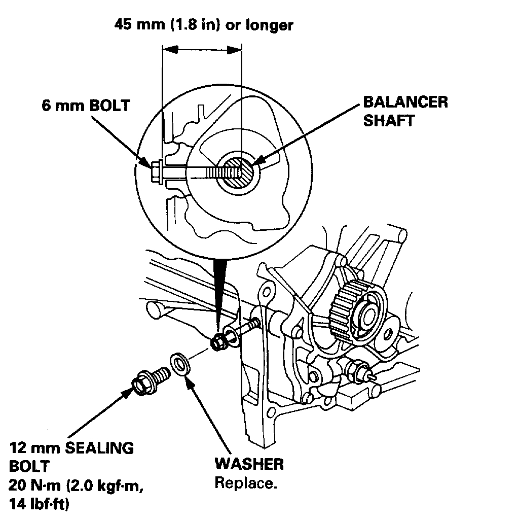 12. Align the maintenance hole and the balancer shaft hole. Insert a 6 mm bolt that is at least 45 mm (1.8 inch) long into the balancer shaft.