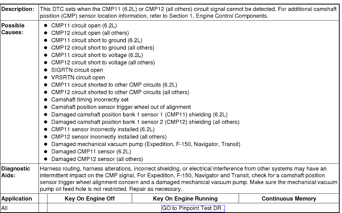 Vehicle Powertrain Management Computers and Control Systems Testing and Inspection Diagnostic Trouble Code Tests and Associated Procedures Powertrain Control / Emission Diagnostics (PCED) SECTION 5: Pinpoint Tests DR: Camshaft Position (CMP) Sensor - Pinpoint Test