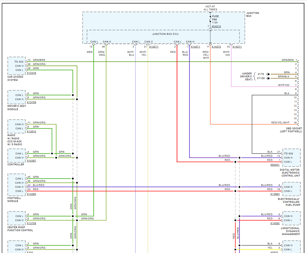 Is this a euro car? The VIN didn't work but here are the CAN bus wiring diagrams with the data connector so you can see how the system works. Check out the images (below). Let us know if you need anything else.
