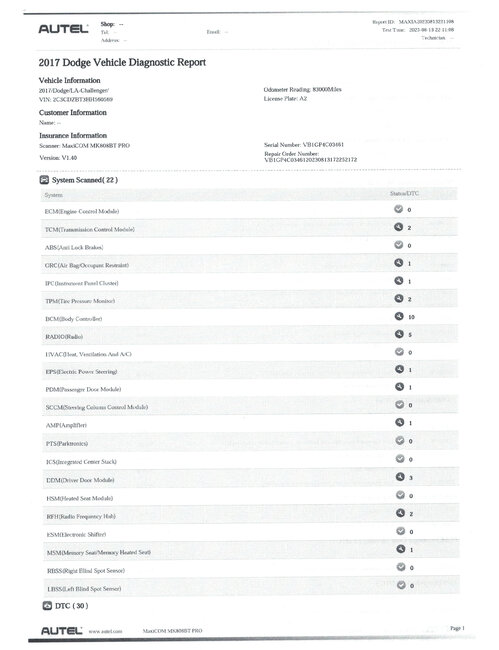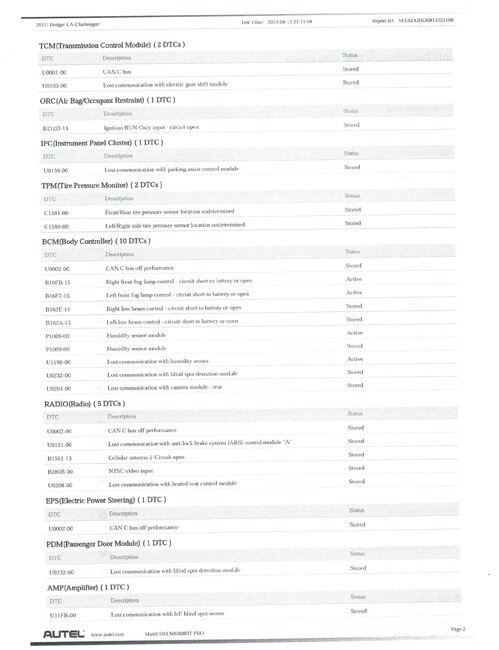 The car listed above is an r/t model, and it does not crank. I scanned the vehicle and multiple CAN Bus codes are stored (DTC Report attached). The only Active codes are B16FB-15 "Right Front Fog Lamp Control-Circuit Short to Battery or Open," B16F7-15 "Left Front Fog Lamp Control-Circuit Short to Battery or Open,"P1009-00 "Humidity Sensor Module" and U1190-00 Lost communication with humidity sensor."