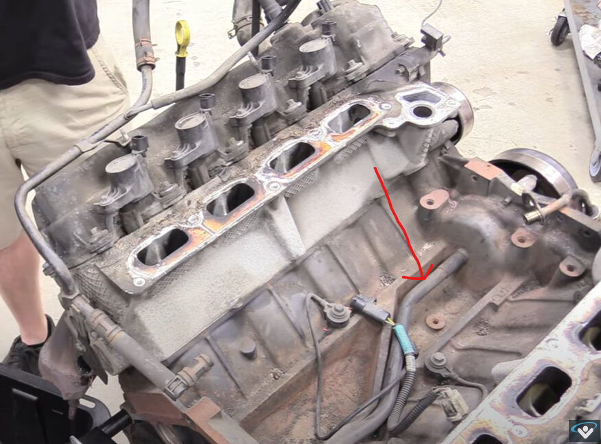 There is a heater hose tube that runs under the intake manifold that can rot out due to rust and cause a leak like you have described which is common. The intake must be removed to fix the leak. Here are the instructions on how to do so. Here is the heater hose tube I am talking about. Also check out this video which can help walk you through the repair:
