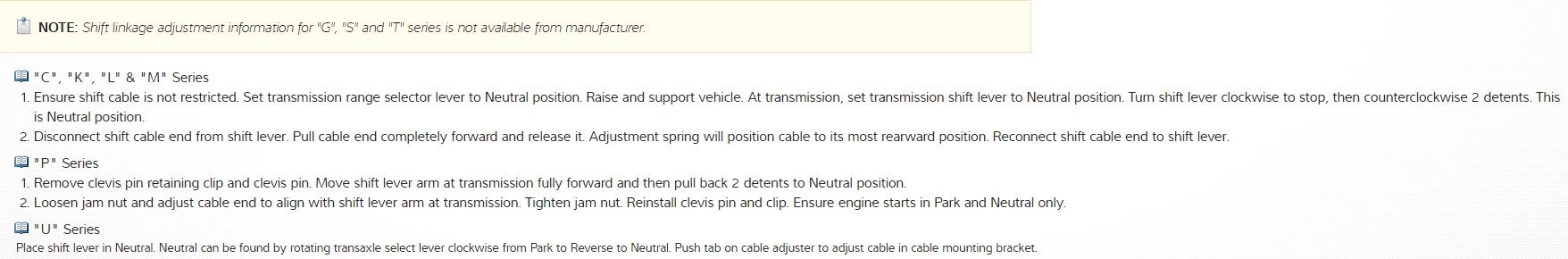 Although this is a T series and the manual says "Shift linkage adjustment information for "G", "S" and "T" series is not available from manufacturer." You can try one of these procedures.