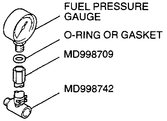 4. Place a suitable O-ring or gasket on the assembled special tools MD998709 and MD998742 and install the fuel pressure gauge.