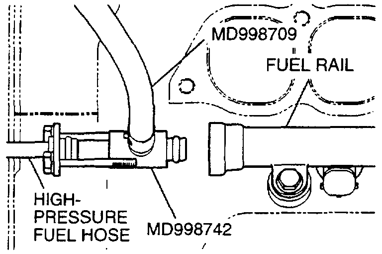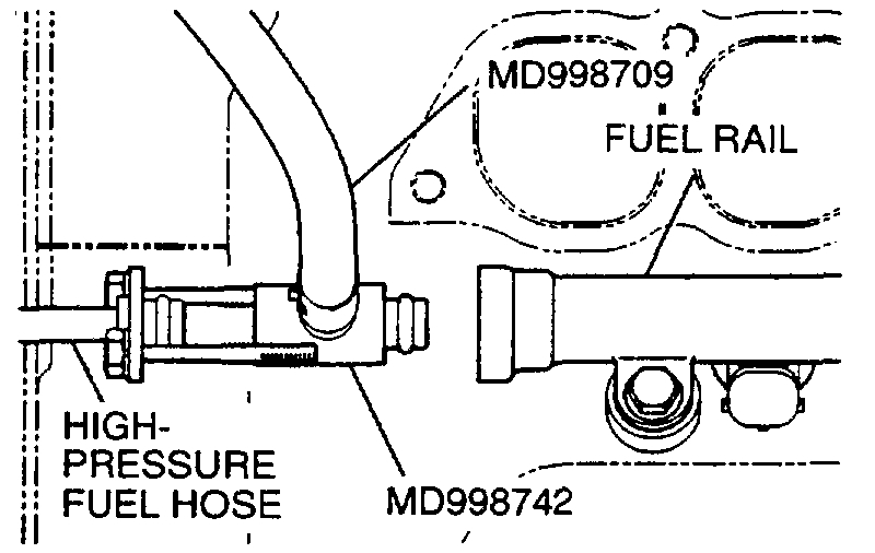 5. Install special tool MD998742/MD995709 (created in steps 3 and 4), between the fuel rail and the high-pressure fuel hose.