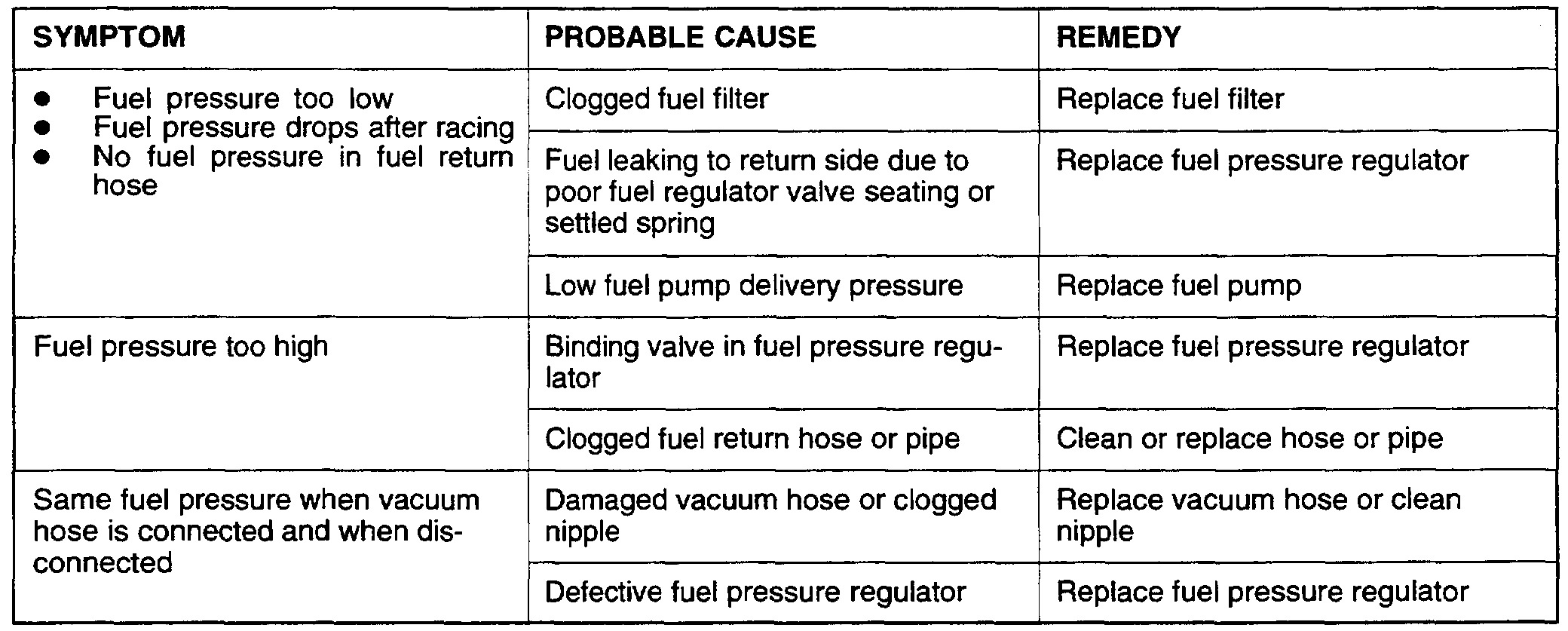 14. If any of fuel pressure measured in steps 10 to 13 is out of specification, troubleshoot and repair according to the table above.