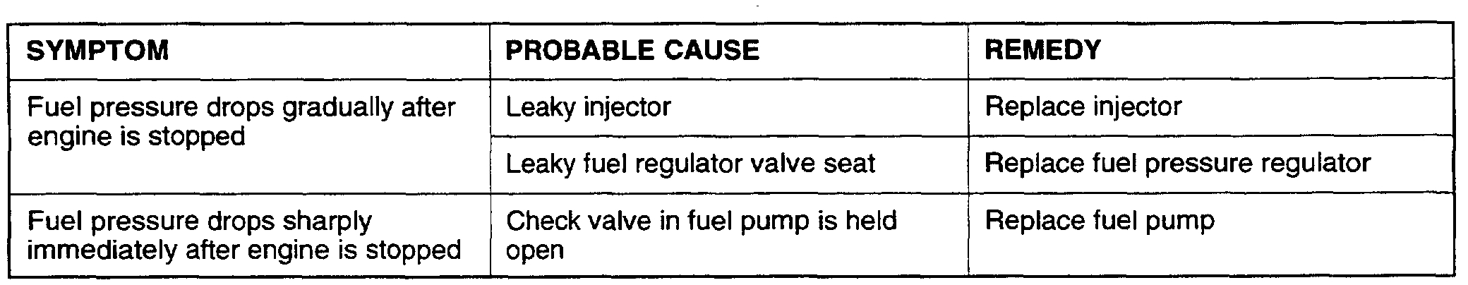 15. Stop the engine and observe fuel pressure gauge reading. Normal if the reading does not drop within two minutes. If it does, observe the rate of drop and troubleshoot and repair according to the table above. Start, then stop the engine.