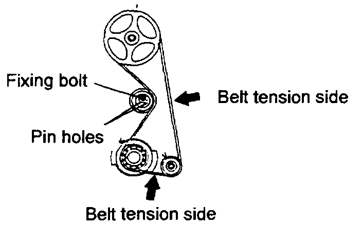 (4) Set the tension pulley so that the pin holes are at the bottom, press the tension pulley lightly against the timing belt, and then provisionally tighten the fixing bolt.