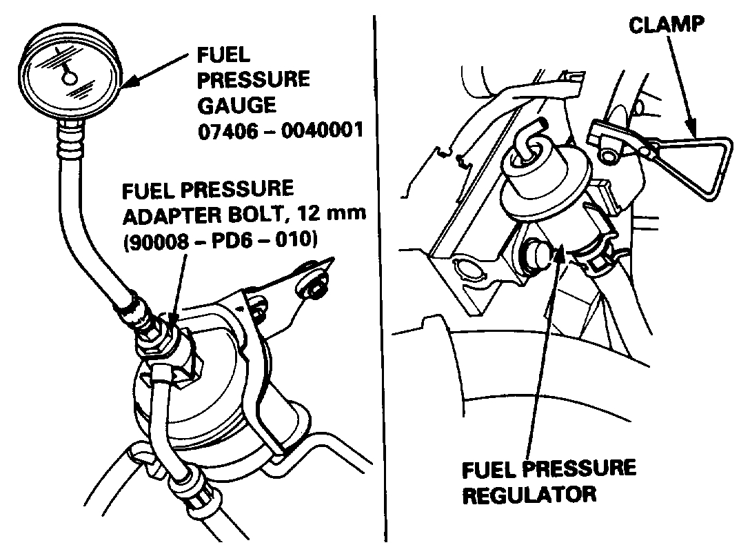 3. Start the engine. Measure the fuel pressure with the engine idling and the vacuum hose of the fuel pressure regulator disconnected from the fuel pressure regulator and pinched. If the engine will not start, turn the ignition switch ON (II), wait for two seconds, turn it off, then back on again and read the fuel pressure.