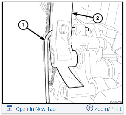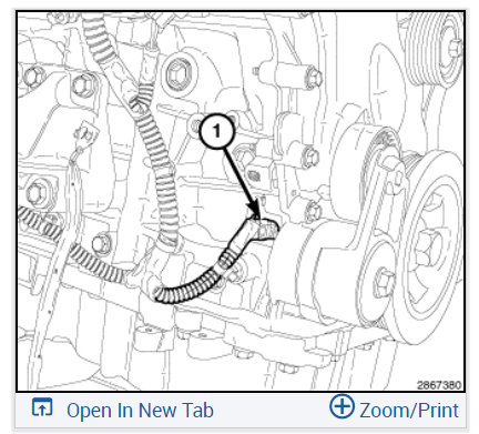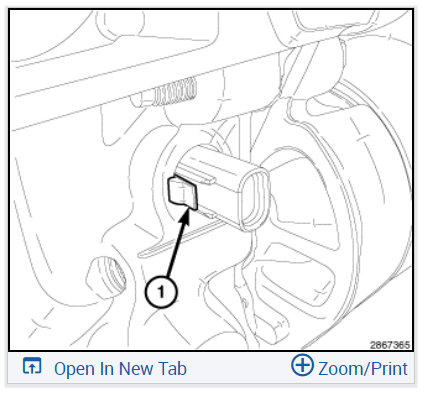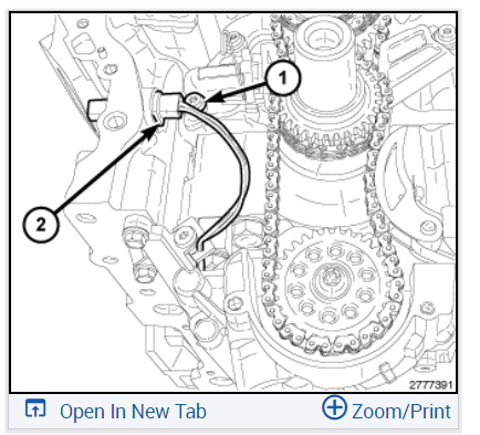 Push the oil pump solenoid electrical connector into the engine block, rotate the connector slightly CW, push it past the primary chain tensioner mounting bolt (1) and into the engine.
