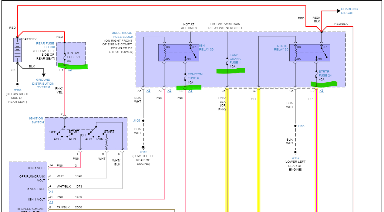 If the fuses in the first diagram are okay, then the Relays IGN Relay 35 and STRTR Relay 30 need to be checked next.