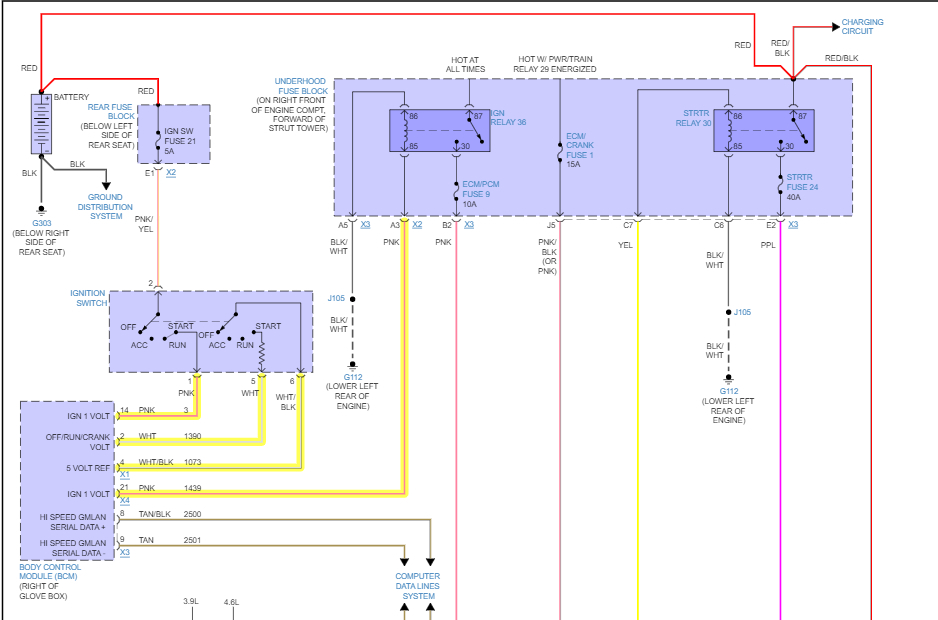 Hello, this vehicle has a somewhat complicated starting system. When you turn the ignition switch to Start, the ignition switch sends two voltage signals to the Body Control Module (BCM). The BCM then energizes the IGN Relay 36, a voltage signal from there goes through ECM/PCM Fuse 9 to the Engine Computer (ECM). At the same time Relay 29 is energized and sends a voltage to the ECM IGN VOL pin.