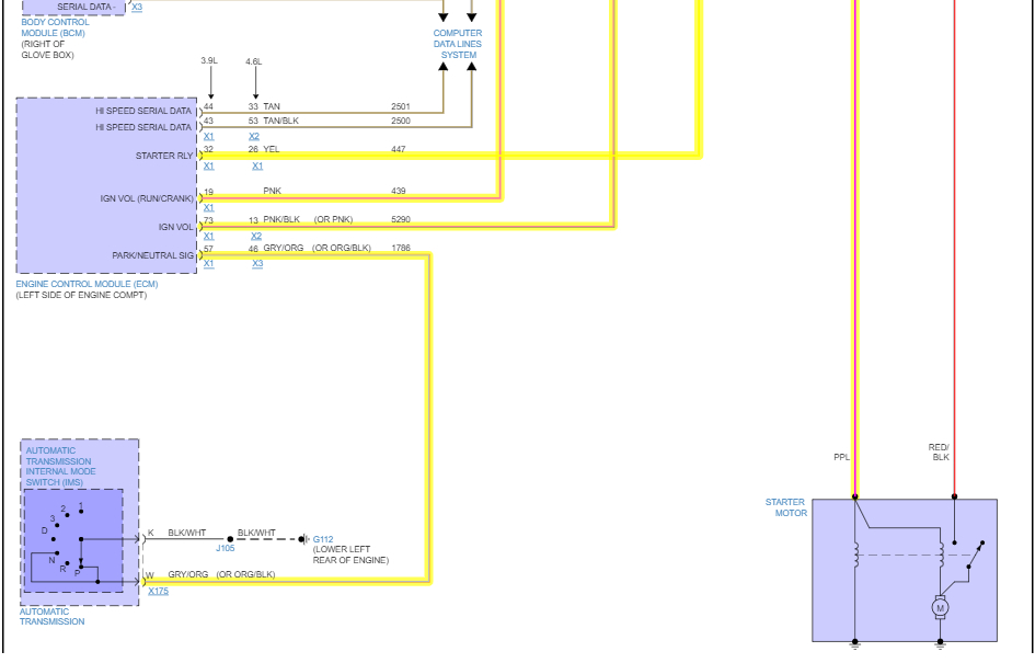 The ECM also has to see the Park/Neutral Signal to know the vehicle is not in gear as a safety precaution. From there the ECM energizes the Starter Relay (STRTR RELAT 30), which then energizes the Starter motor.