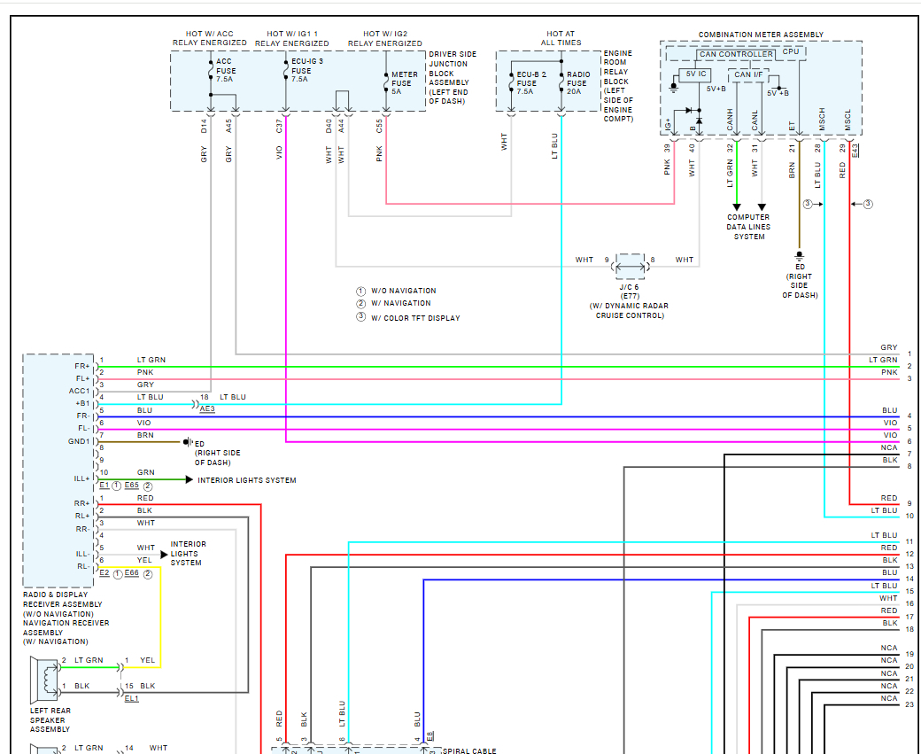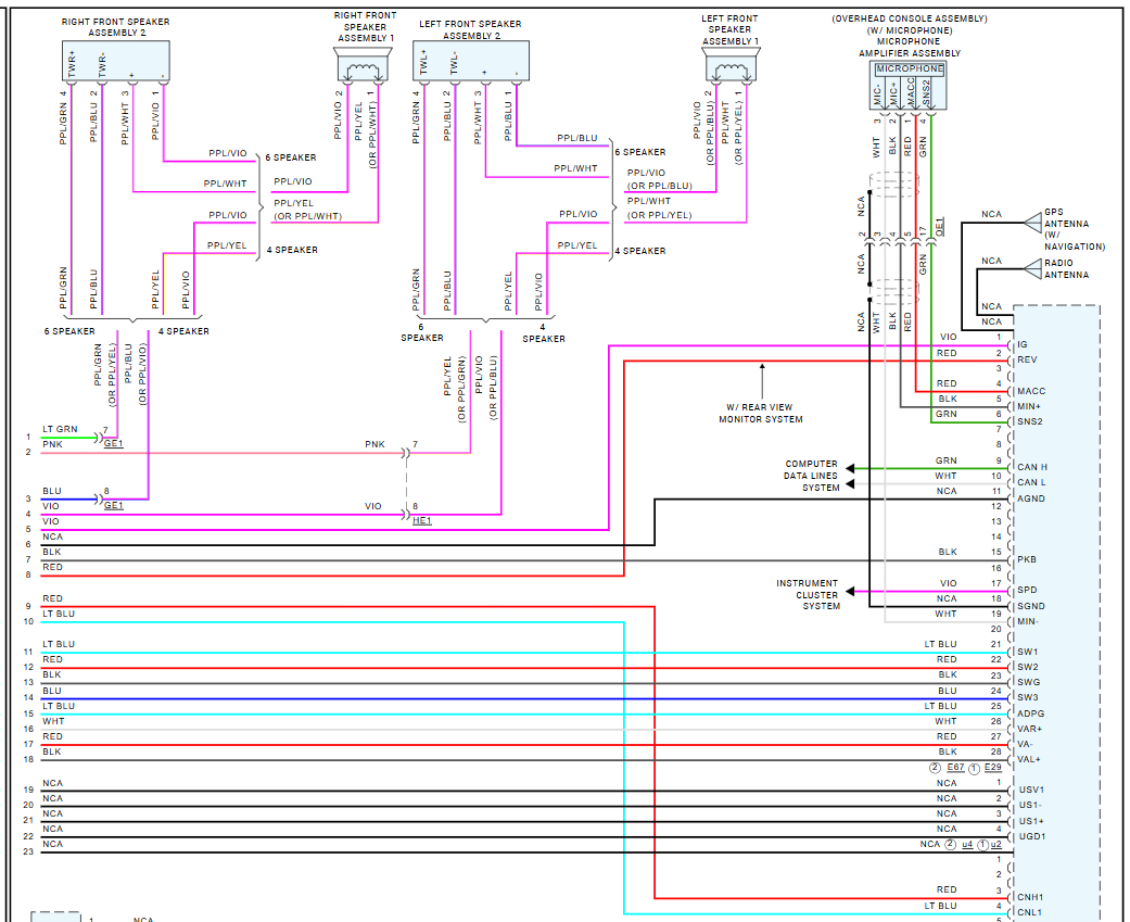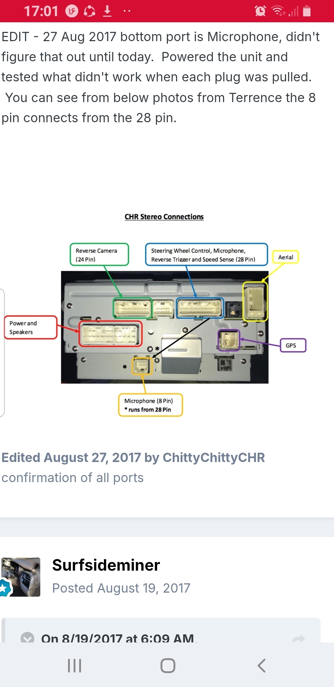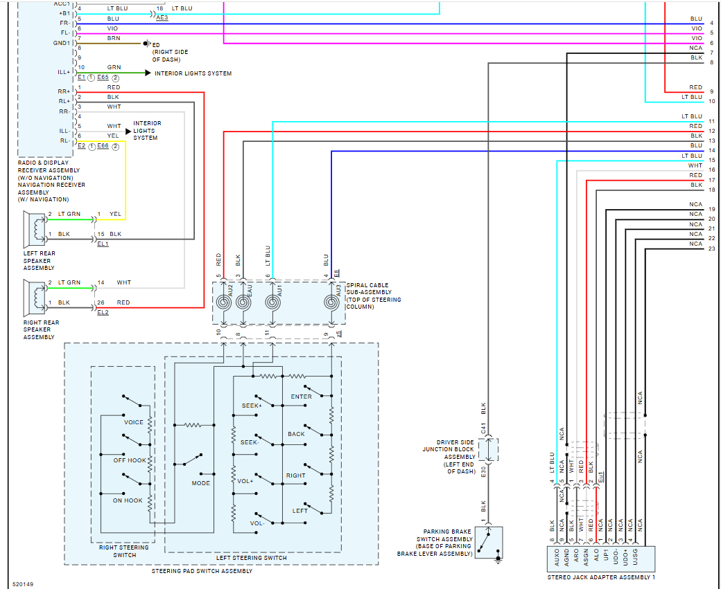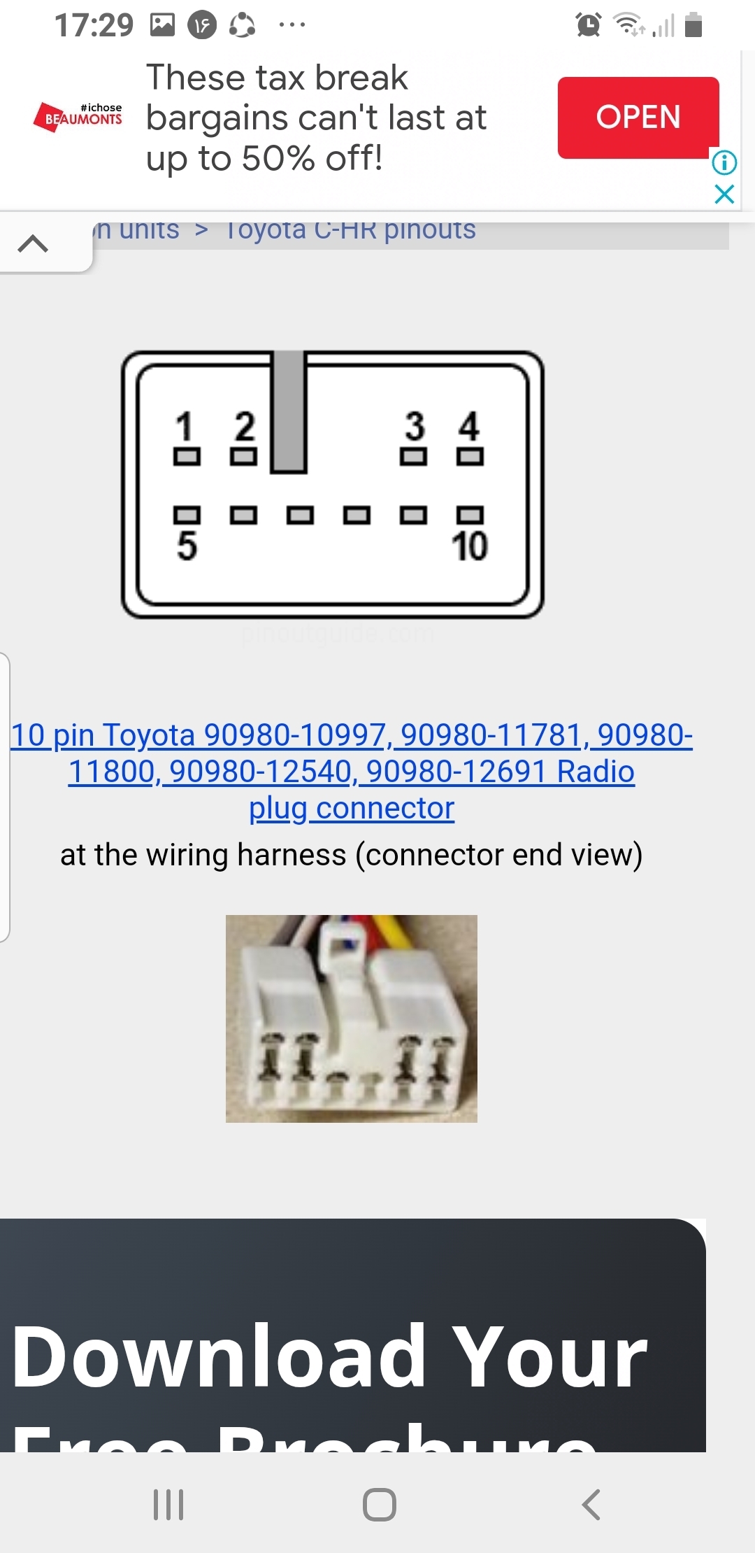 I am looking for a wiring diagram for a 2018 Toyota CHR. More specifically I need the one for the 10 pin and 6 pin connector that plugged into the back of the factory unit. I am looking for the wire diagram so I can properly connect my new navigation unit.