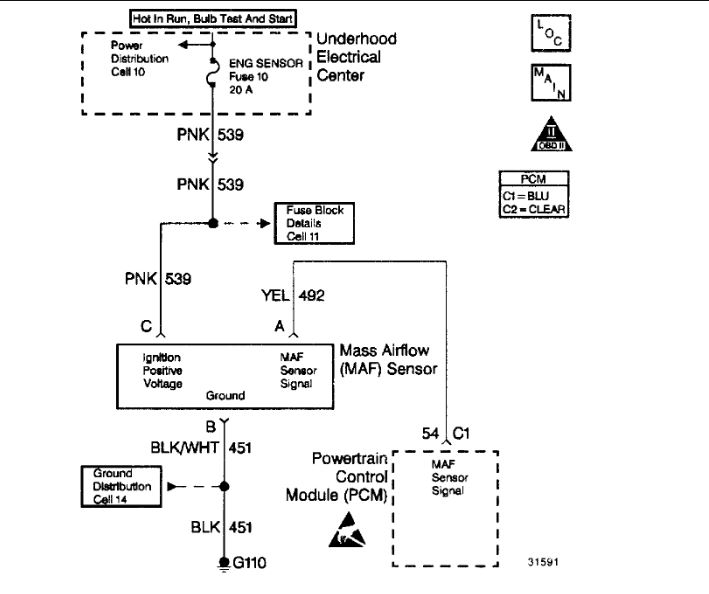 6. Verifies that ignition feed voltage and a good ground are available at the MAF sensor.