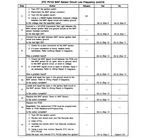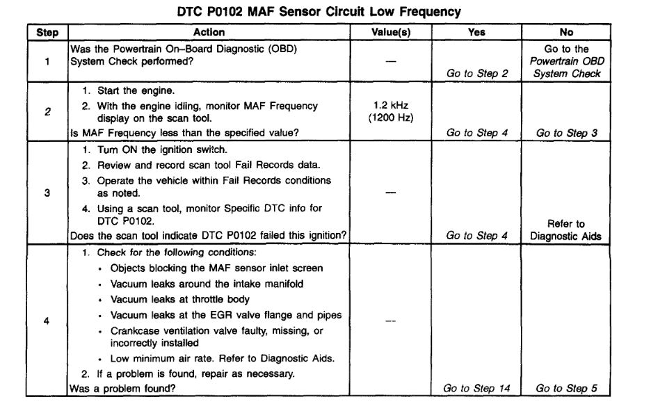 - Plugged intake air duct or filter element. - A wide-open throttle acceleration from a stop should cause the Mass Air Flow displayed on a scan tool to increase from about 4-7 gm/s at idle to 100 gm/s or greater at the time of the 1-2 shift. If not, check for a restriction. If DTC P0102 cannot be duplicated, the information included in the Fail Records data can be useful in determining vehicle mileage since the DTC was last set. This may assist in diagnosing the condition.