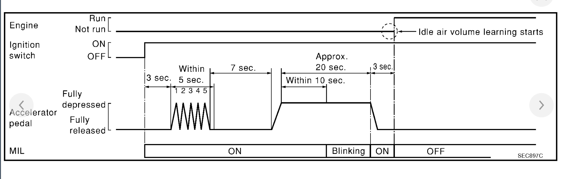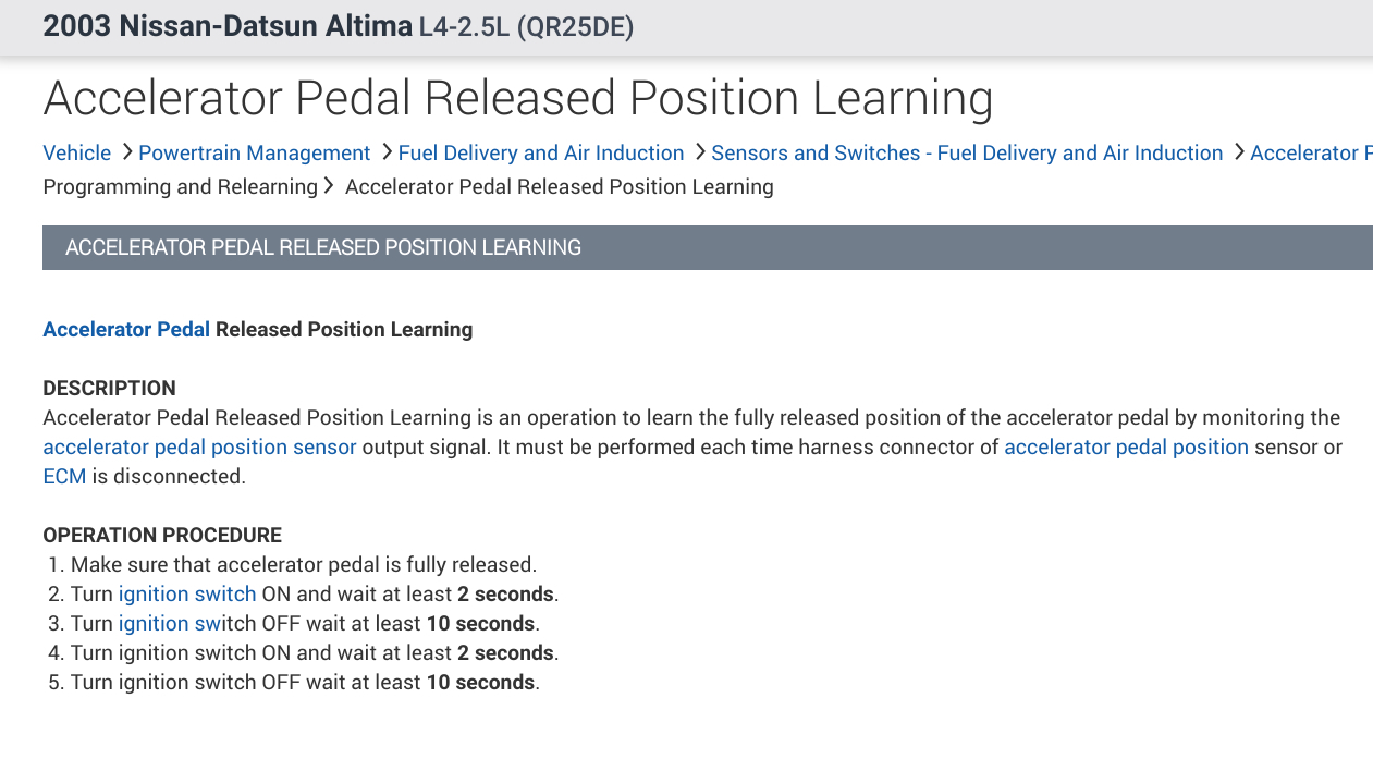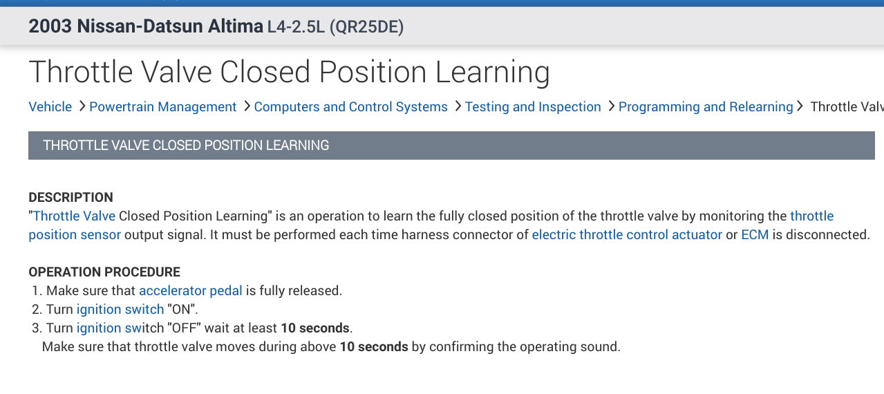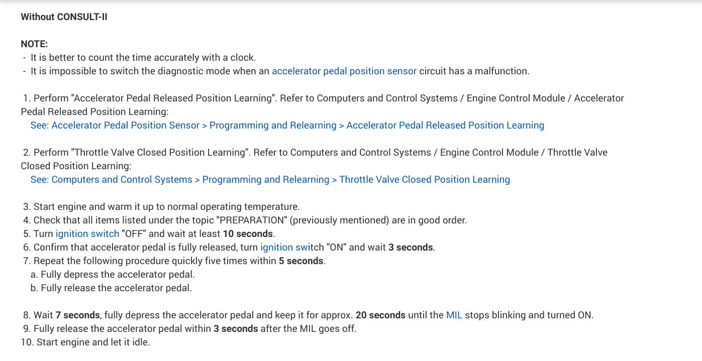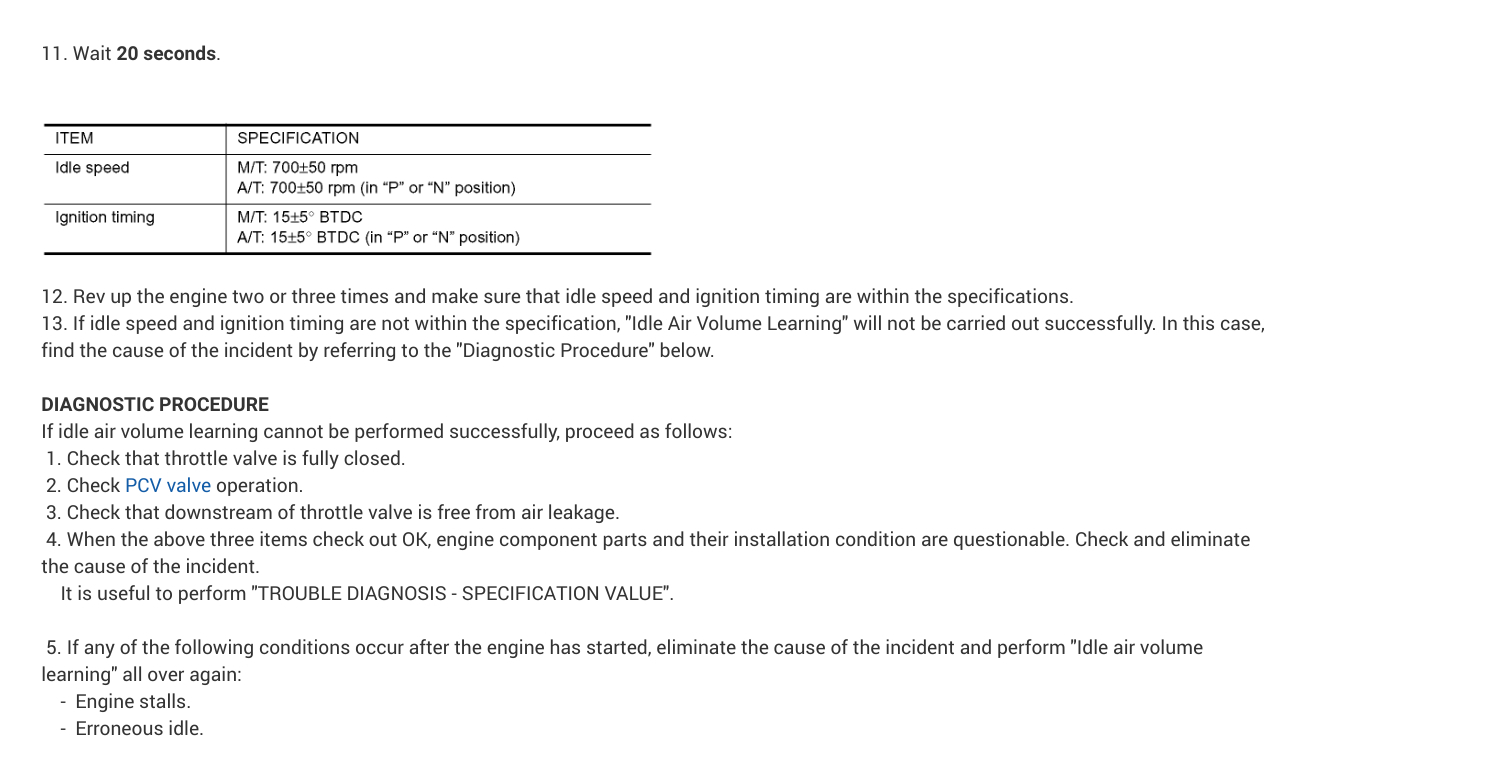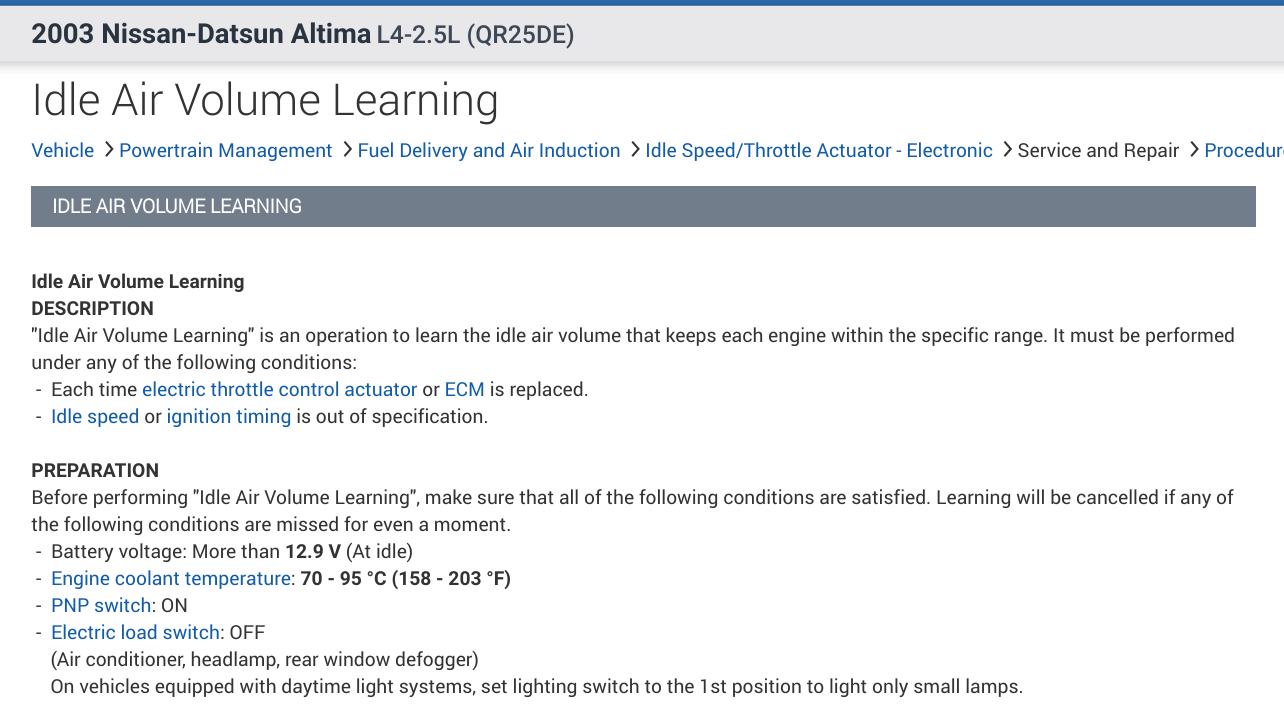 This could be a problem with your vehicle's Idle Air Learning being out of specs. In the diagrams down below I have included the instructions for relearning your vehicle's Idle Air Learning with the use of Nissan's code reader which is called the Consult 2. Please go through these guides and get back to us with how everything turns out.