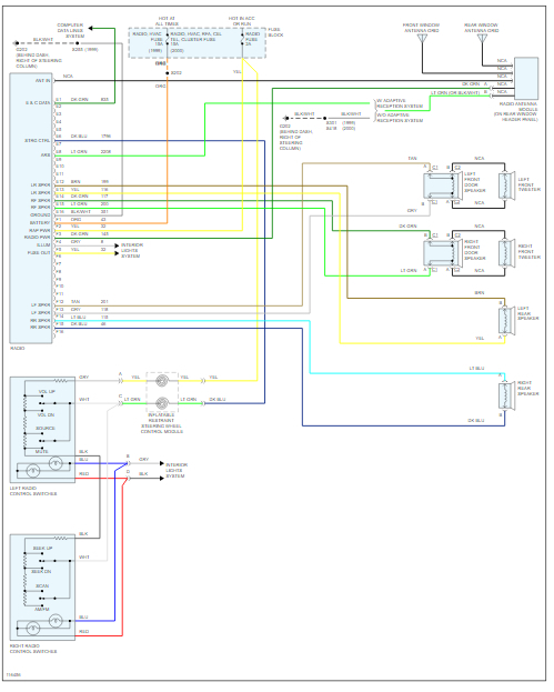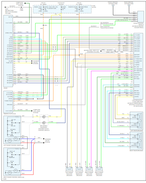 I've attached pictures below of the wiring diagrams you've requested. The first picture is system with an amplifier and the second picture is without. Third picture is of steering wheel controls and last picture is where amplifier would be located if equipped.Hope this helps and thanks for using 2CarPros.