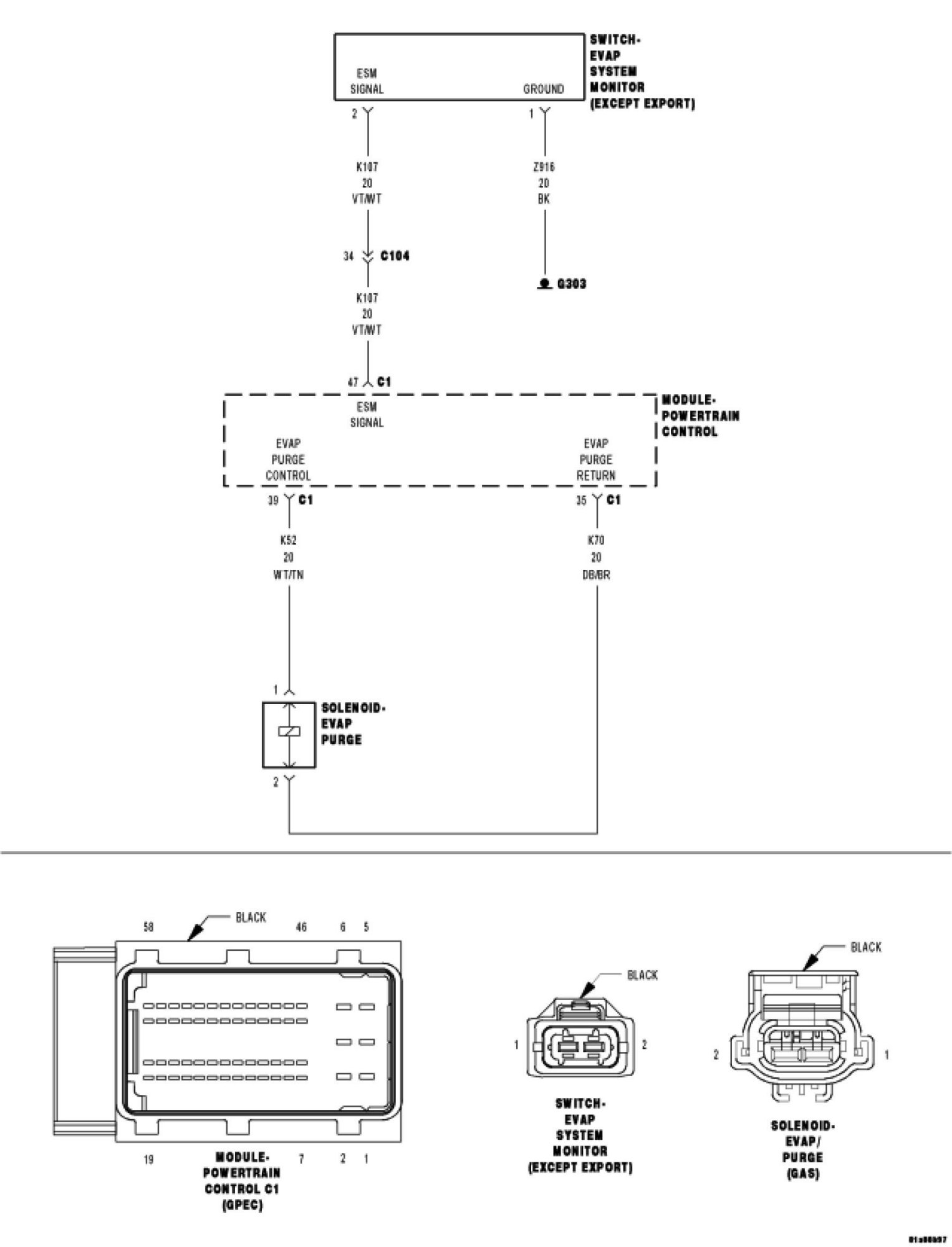 Using the wiring diagram/schematic as a guide, inspect the wiring and connectors between the Evap Purge Solenoid and the Powertrain Control Module (PCM) and between the Evap System Monitor Switch and the Powertrain Control Module (PCM).