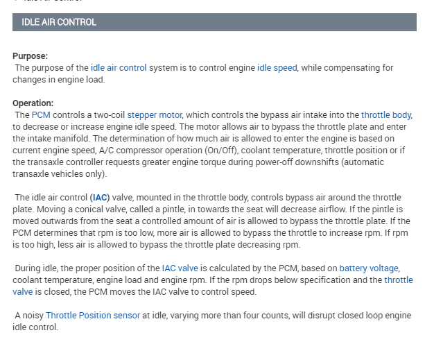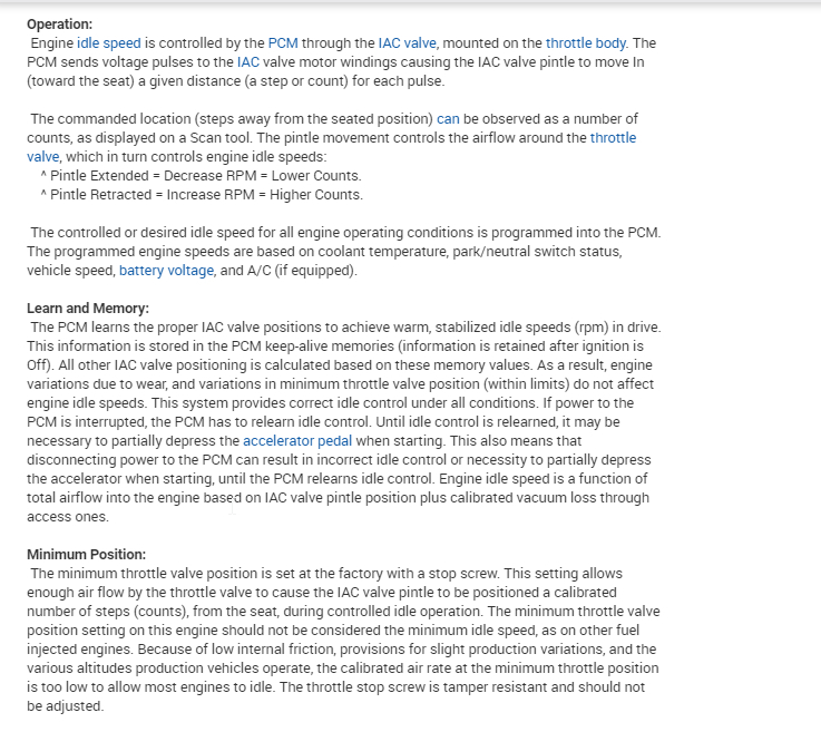 Then when you hook the battery back up, start the engine and let it idle for a couple minutes but do not drive it. Then shut it off for a couple minutes and then go drive it and see if it is any different. The ECM does a relearn of the IAC every time the engine runs and then shuts off. It commands the IAC plate to the full closed position and then back to the desired location.