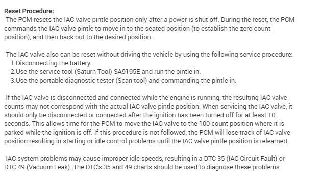 I have not had much success over the years with resetting the system but let's try it here. There is a reset procedure for the IAC and it can be done one of three ways. Two of them require a scan tool and most don't have one. The other is a battery disconnect. So take both terminals off the battery and touch them together. This is called a complete battery discharge. Then leave the battery unhooked for about 10 minutes.