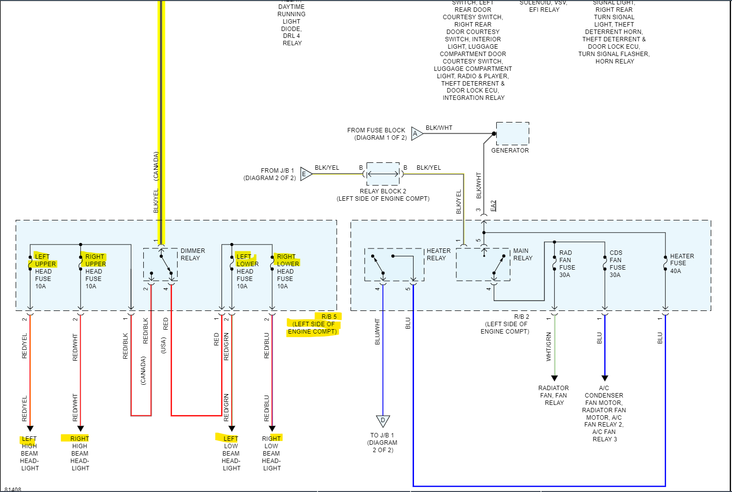 The diagrams 4,5 are the power feeds for the head lamps. I would try pulling out the Dimmer Relay, and some of the fuses for the head lights, see if any of these things changes the fault. or effects it at all. This might give us some direction as to what is happening.