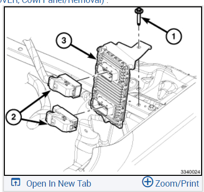 Remove the cowl plenum cover/grille panel from over the wiper module (Refer to 23 - Body/Exterior/COVER, Cowl Panel/Removal) .