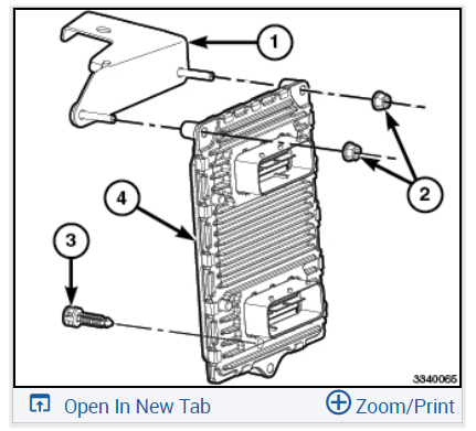 If removed, position the Powertrain Control Module (PCM) mounting bracket (1) onto the PCM (4), install the two retaining nuts (2) and tighten to the proper (Torque Specifications) .