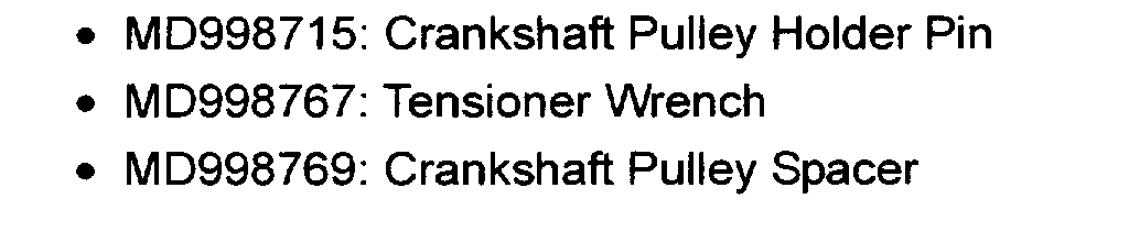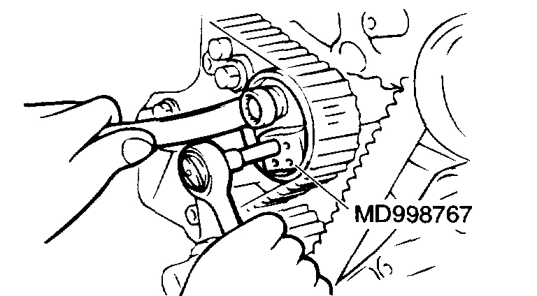 4. Use special tool MD998767 to push the tensioner pulley into the timing belt, then temporarily tighten the center bolt.