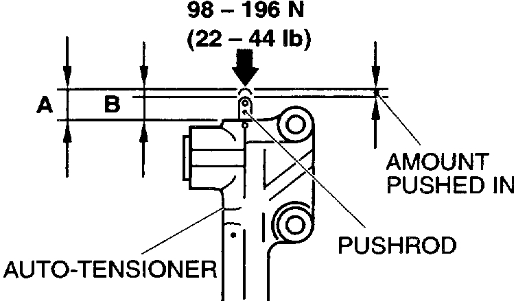 1. While holding the auto-tensioner with your hand, press the end of the pushrod against a metal surface (such as the cylinder block) with a force of 98 - 196 N (22 - 44 pound) and measure how far the pushrod is pushed in.