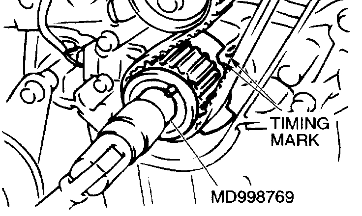 5. Use special tool MD998769 to turn the crankshaft 1/4 turn counterclockwise, then turn it again clockwise until the timing marks are aligned.