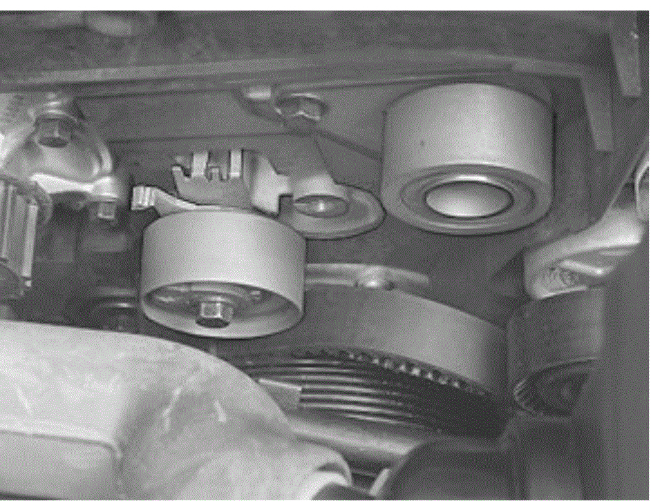 - hold the centre screw on the belt tensioner fixed. Turn the belt tensioner eccentric counter-clockwise until the tensioner indicator passes the marked position.