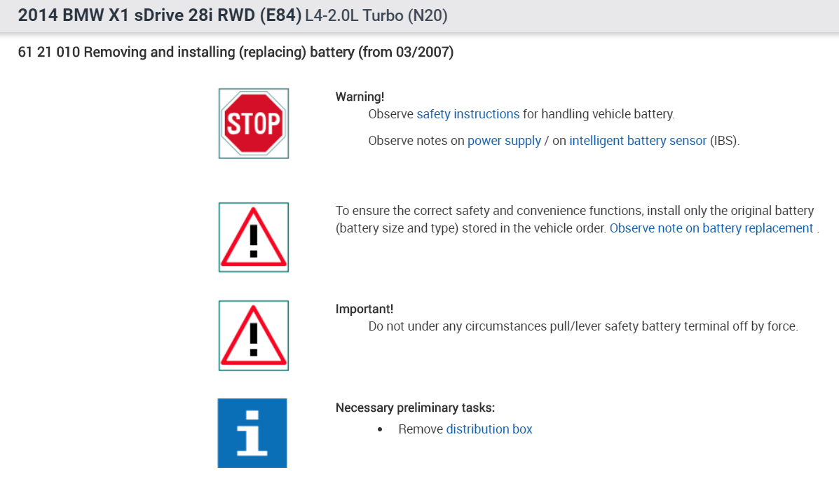 Vehicles with the automatic engine start-stop function or particular engine types and optional equipment are equipped with a special vehicle battery (AGM battery), since only this battery type can provide elevated power requirements over the extended service life. Installing a different vehicle battery can cause problems with vehicle electronics, can reduce functions or can cause leakage of battery acid.