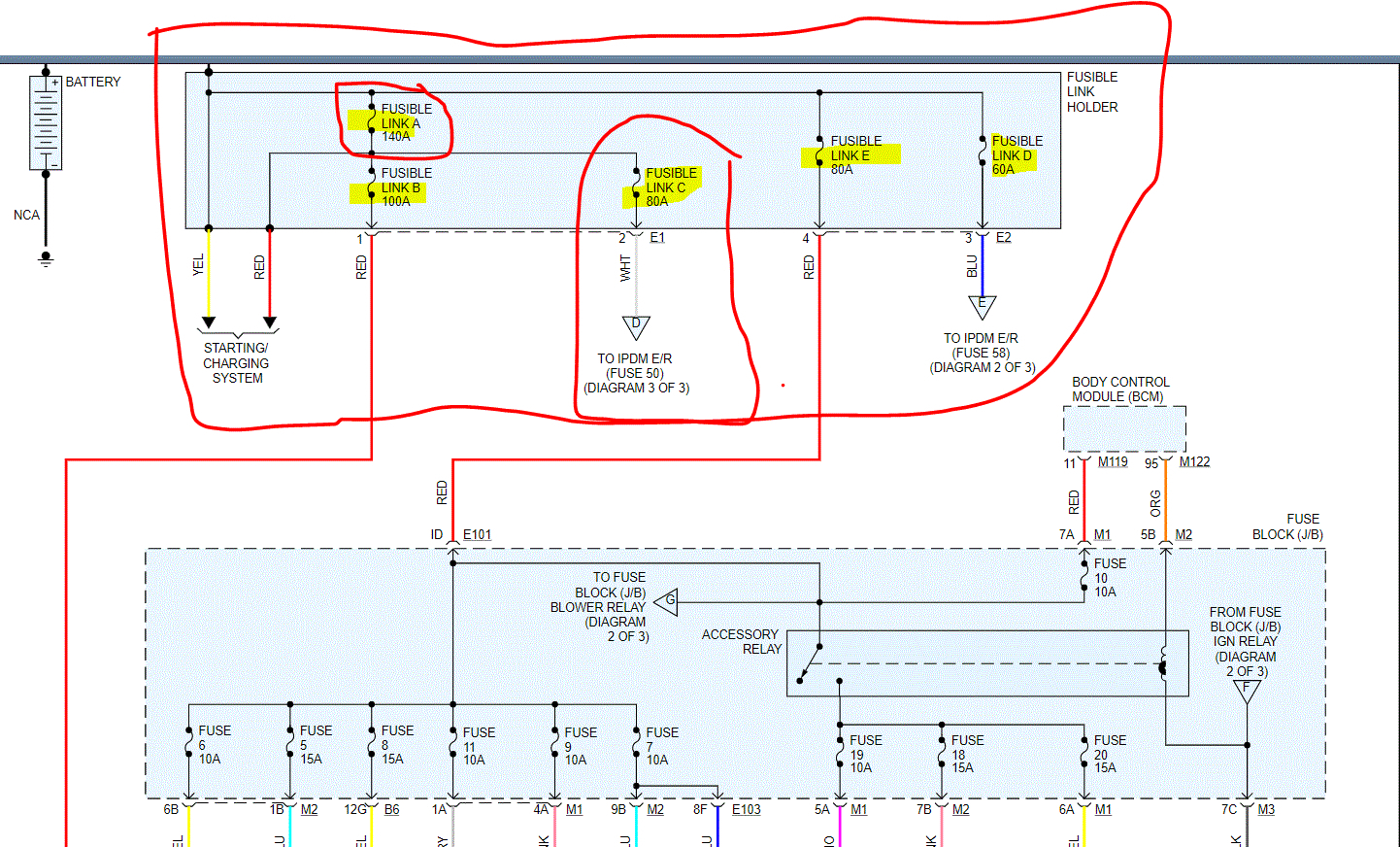 First, have you confirmed the battery is fully charged and the terminals are clean and tight? Next, if you look at the pic I attached, it shows that power throughout all systems start a what is called fusible links. A fusible link is basically a wire that works like a traditional fuse. If excessive power flows through this link, internally, the wire will fail to protect the circuits.