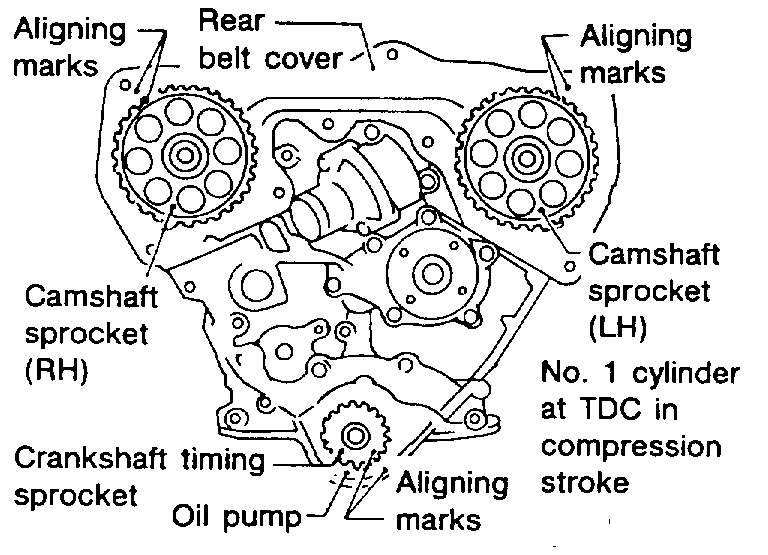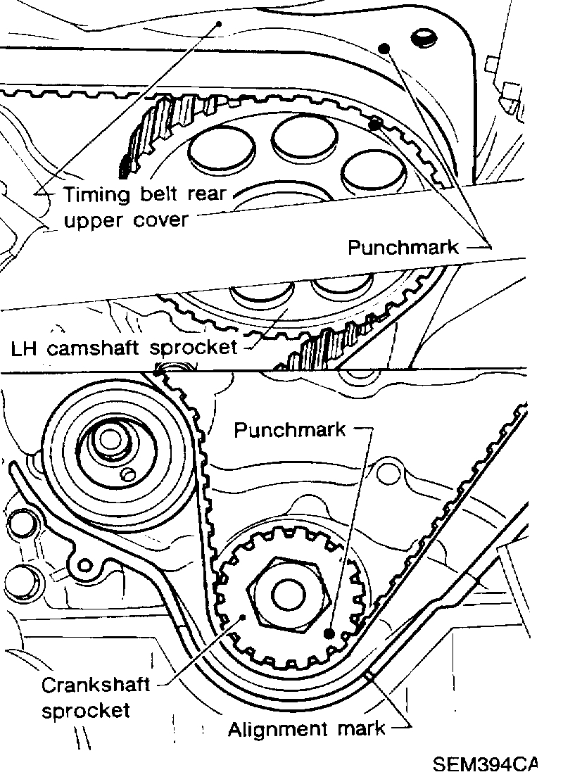 - Align punch-mark on LH camshaft sprocket with punch-mark on timing belt upper rear cover.
