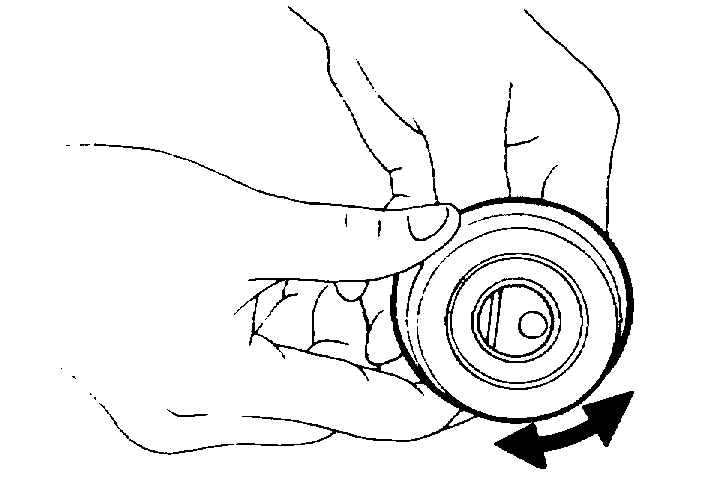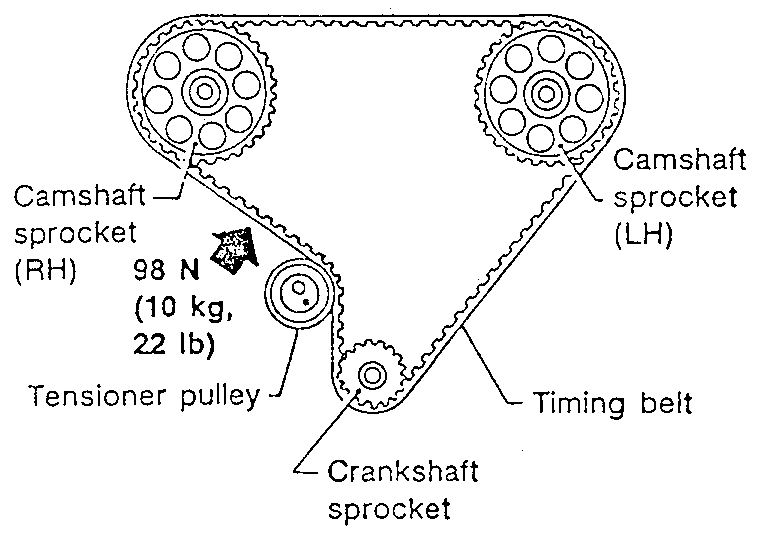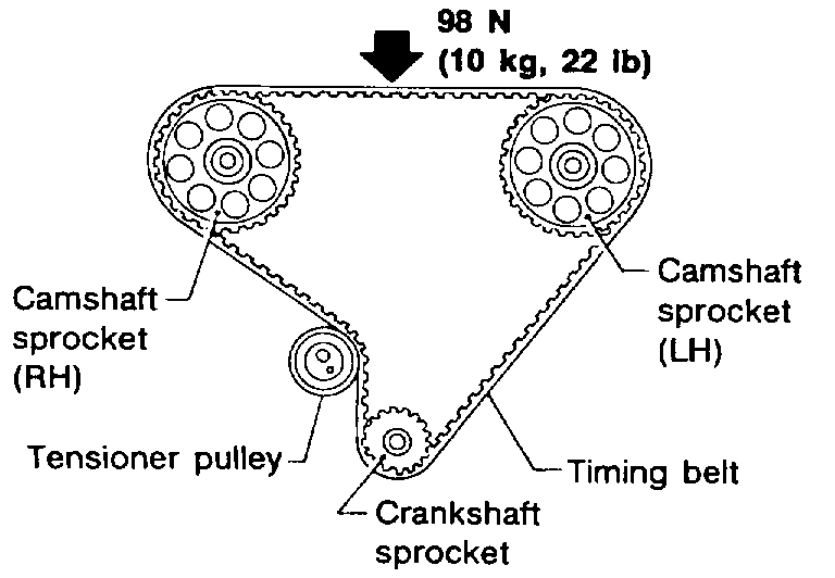 8. Push middle of timing belt between RH camshaft sprocket and tensioner pulley with force of 98 N (10 kg, 22 lb).