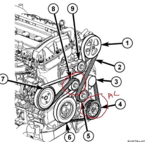 I attached two pics. The first is belt routing for this vehicle, and in the second, I circled the compressor (indicated with AC) and the belt tensioner.