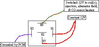 To measure terminal 93 you must have the relay installed. Raise it up enough to fit the meter probe onto the terminal, or wrap a piece of wire around the relay's terminal to use as a test point. I don't like to stuff a wire in beside the terminal because it could stretch the terminal in the socket and cause an intermittent connection. You should see 12 volts there when the relay is turned off. The relay is turned on when terminal 93 gets grounded and the voltage goes close to 0 volts.