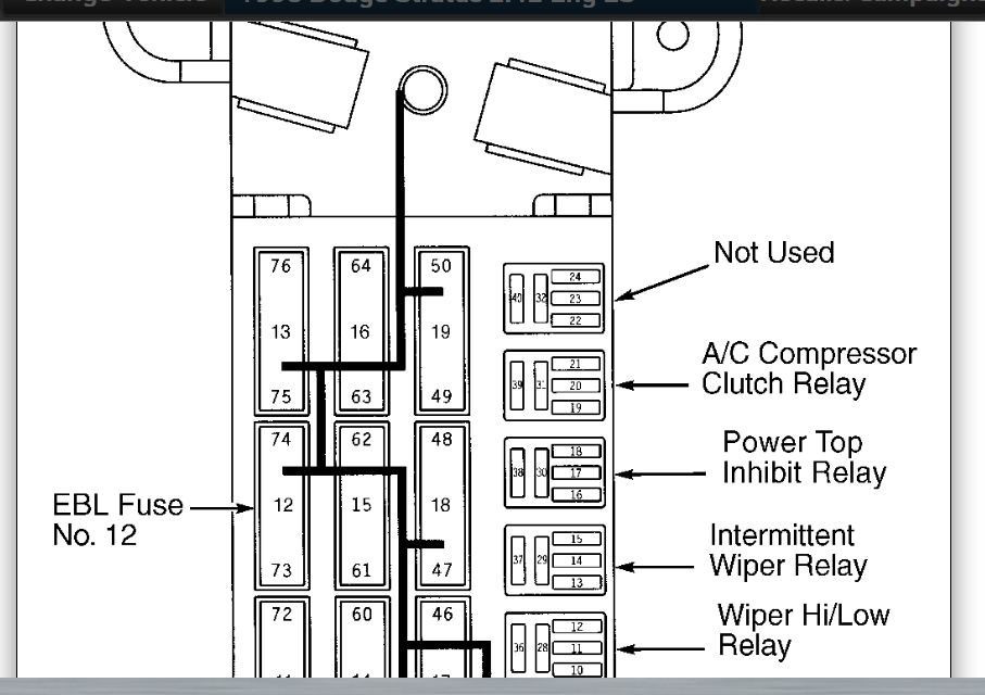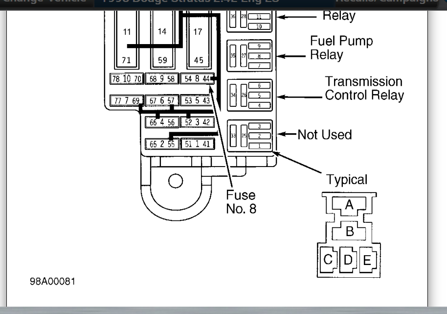 To add confusion to the story, your ASD relay is wired differently than in previous models so your service manual might be wrong. Below is my sad drawing of the typical relay layout and common terminal numbering with the numbers you're using. The next one shows the Stratus relay. Two terminals must have 12 volts all the time. The ignition switch is no longer involved in the relay's coil circuit. This would agree with what you found already.