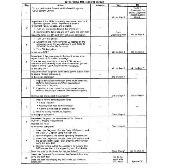 A voltage is supplied directly to the Malfunction Indicator Lamp (MIL). The PCM controls the lamp by grounding the control circuit via an internal switch called a driver. The primary function of the driver is to supply the ground for the component being controlled. Each driver has a fault line which is monitored by the PCM. When the PCM is commanding a component ON, the voltage of the control circuit should be low (near 0 volts). When the PCM is commanding the control circuit to a component OFF, the voltage potential of the circuit should be high (near battery voltage). If the fault detection circuit senses a voltage other than what is expected, the fault line status will change causing the DTC to set.