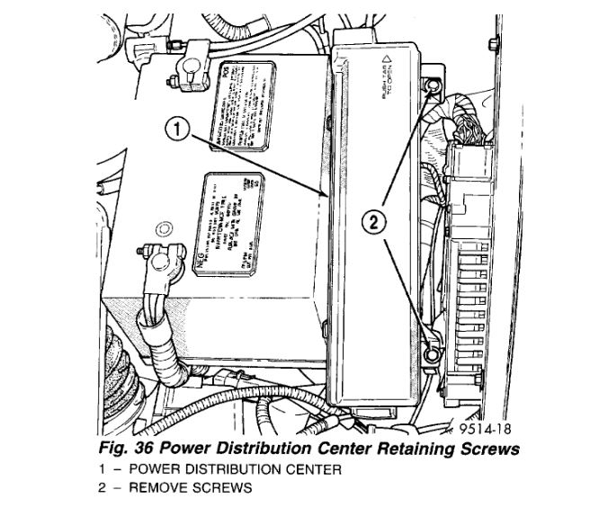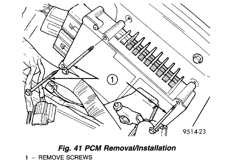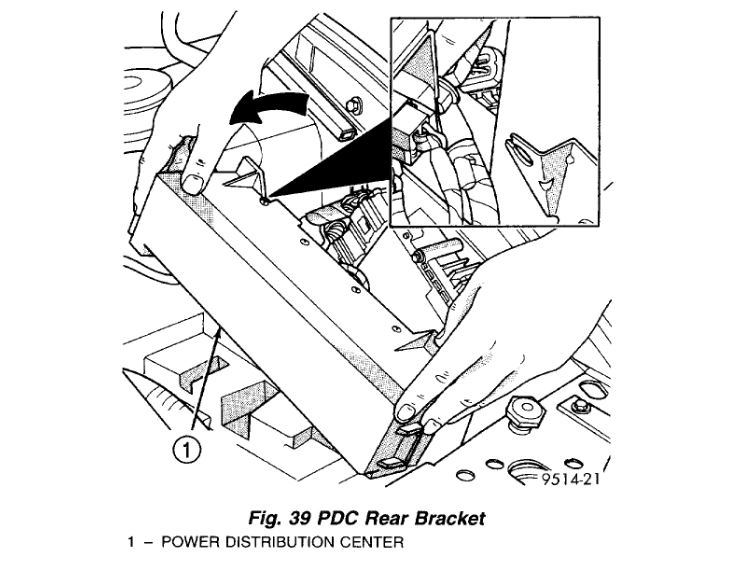7. Pull PDC rearward to remove from front bracket. Lay PDC aside to allow access to Powertrain Control Module (PCM).