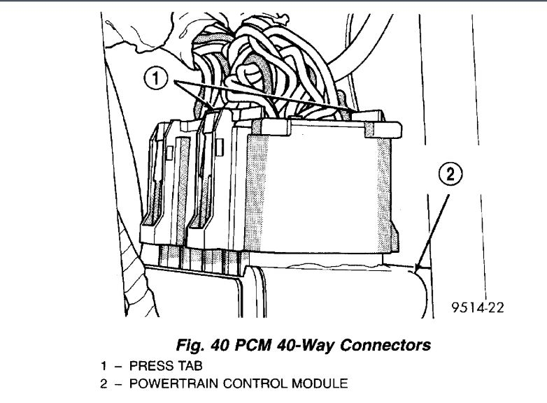 8. Squeeze tabs on 40-way connector. Pull connector rearward to remove from PCM. Remove both way connectors.