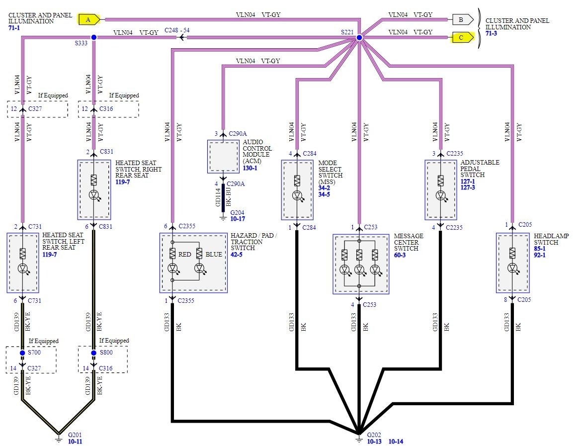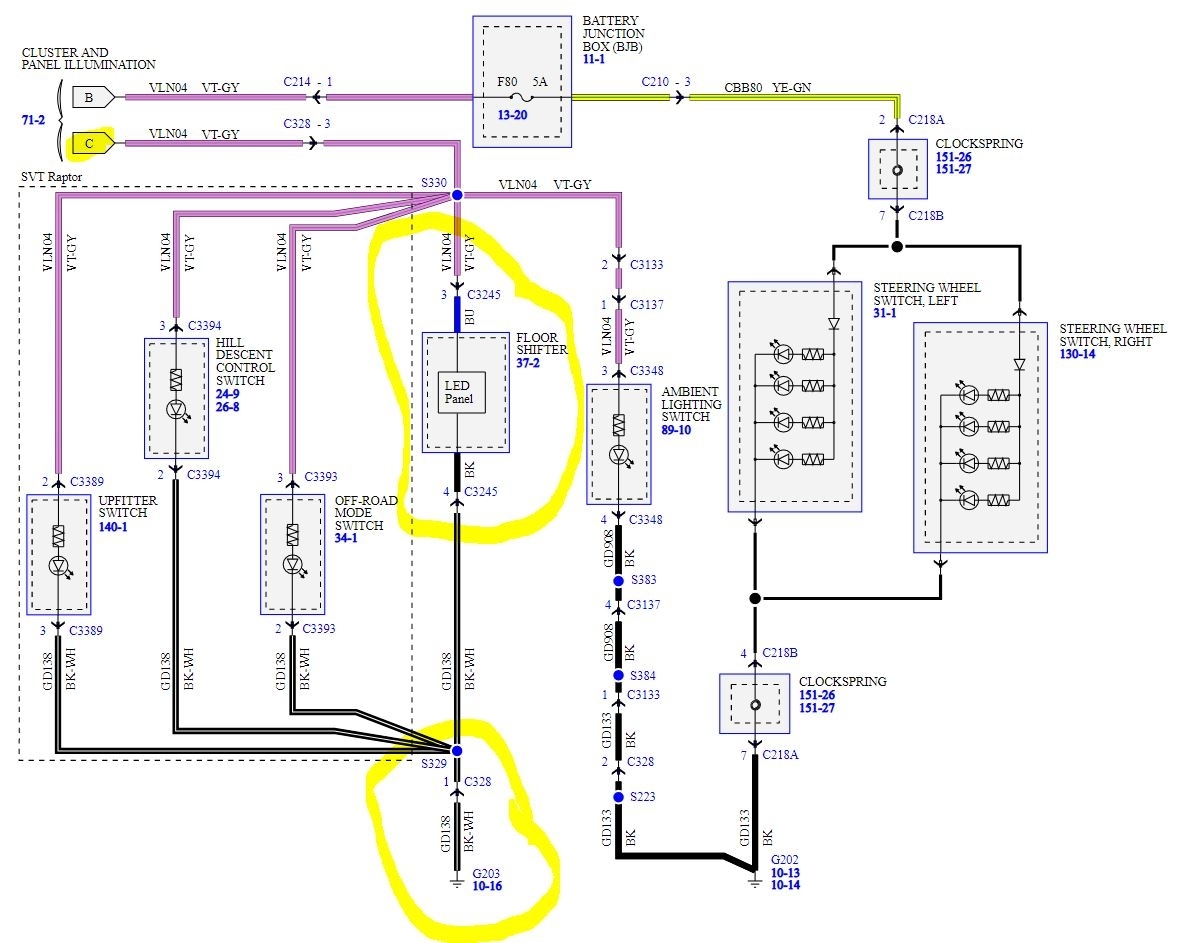 To test if it is a power issue you would need to jumper power from the violet wire with gray stripe to one of the other violet with gray wires that feed the other lighting and see if it works. There is at least one connection between those lights and the floor shifter so it could be a bad connection in that.