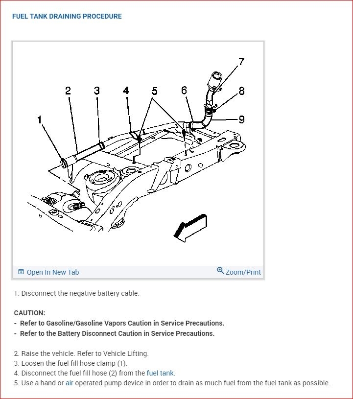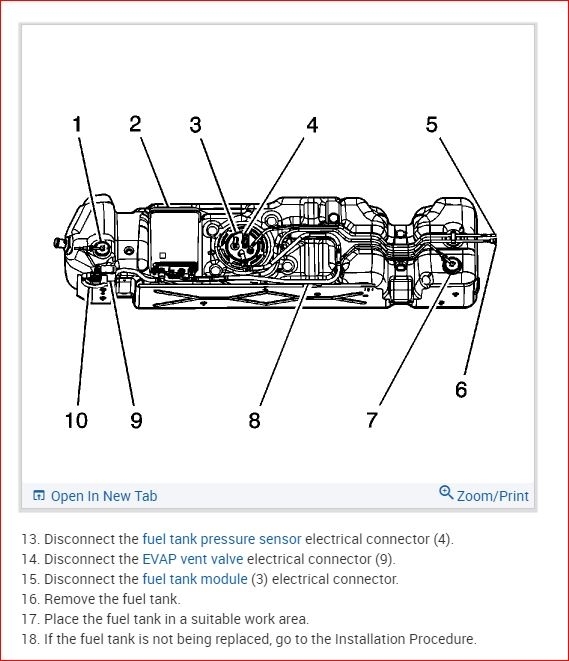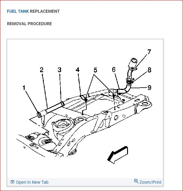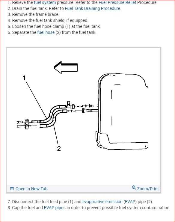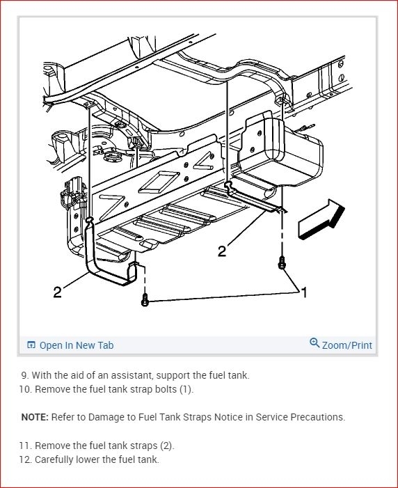 I attached the procedure on how to remove the tank so you can comb through it just to see what you need to take down in order to start dropping it. I would suggest keeping the fuel strap connected on the side that is closest to the filler neck so that you always have something holding the tank. The last thing you want is to have the tank suspended by the EVAP lines or others. You can loosen this strap so that you can get a better angle but do not take it completely off because you will need to take the other strap completely off.