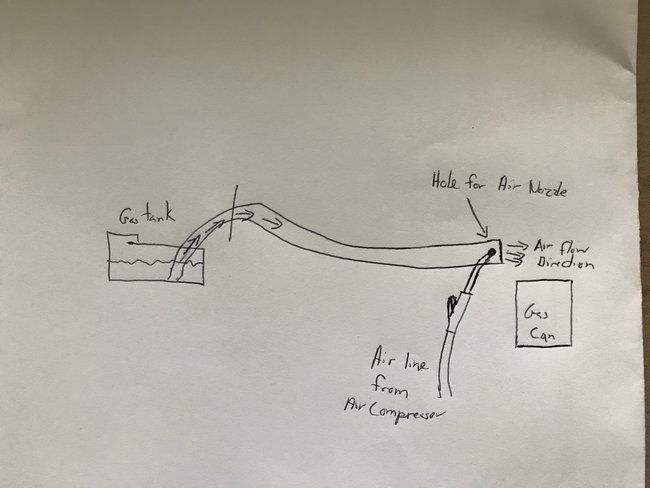 I included some documents for your review. Including a very crude drawing of what I am talking about with the air hose. Hopefully this will make it clear what is supposed to happen. Once you do it, it will make sense because it is very straight forward. You are siphoning fuel the old fashion way but just replacing your mouth with an air nozzle. The only tricky part is getting the angle of the compressed air and possibly the depth in which you put air nozzle into the hose. Play with the angle and depth a little if it doesn't work at first. It will take a couple seconds for the fuel to make it up the hose and come out so don't think it will be immediate.
