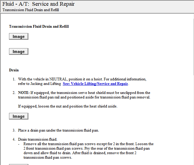 Check fig 1 for type of the fluid, fig 2,3,4. for complete procedure of transmission fluid replacement,fig 5. for fluid capacity,fig 6. heat shield,fig 7. fluid pan,fig 8. magnet inside the pan. fig 9 fluid level indicator.